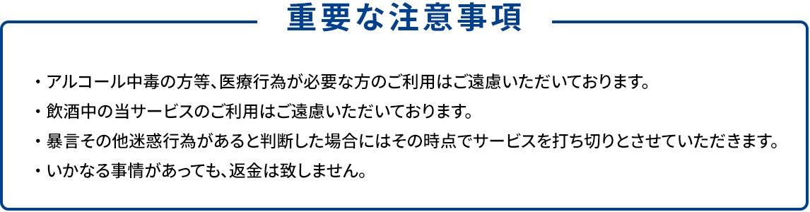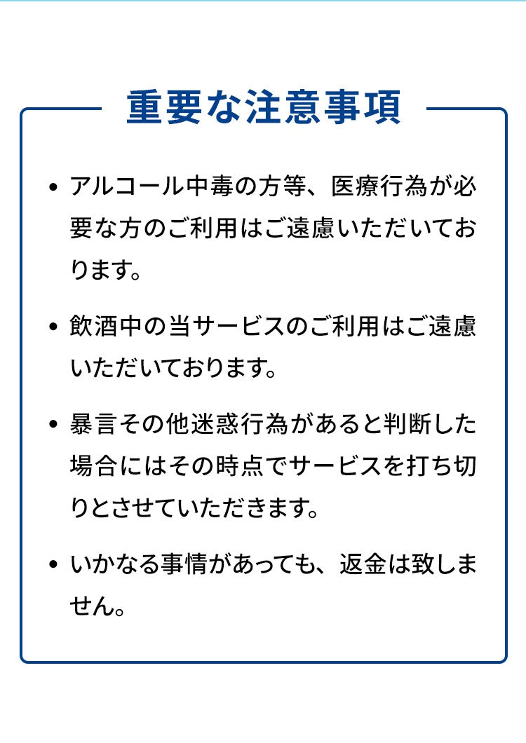 いかなる場合でも、ご予約時間以降の予約変更・キャンセル・ご返金はご対応いたしかねますので、予めご了承くださいませ。